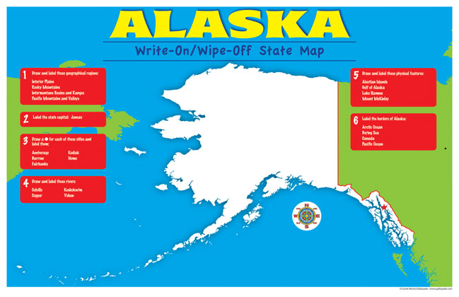 The Alaska Write-on/Write-off State Desk Mat - State Map is a powerful educational resource that allows teachers and students to use over and over. The Alaska Write-on/Write-off State Desk Mat - State Map is 11 inches x 17 inches. One side is in color and has several locate and label activities. The other side is black and white that shows major cities, industries, regions and more. The Alaska state map is on a grid (letter and number) where students can plot coordinates of various locations. The map also helps students to understand relative location, state regions, borders, physical features and more! In addition, there are several activities including fill-in-the-blanks, city grid locations, map scales, map key and compass rose. Use a dry-erase pen to wipe clean to use again and again.
