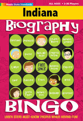 Learn state must-know people while having fun! The game includes 36 different Bingo cards, colorful cover-ups, answer mat for quick easy check, instructions for 10 fun and educational ways to play, fact cards, and funny reward cards. Get the matching History and Geography Bingo cards for 150 different Bingo games.