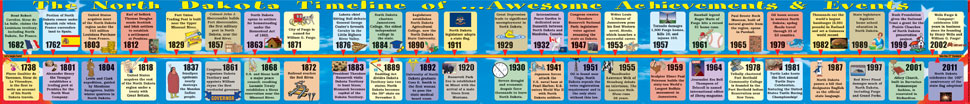 The colorful North Dakota Big Timeline shows an overview of 48 chronological events, important dates and pictures. This Big North Dakota Timeline of awesome achievements and events will stimulate students' imagination to help them visualize important events in history. The North Dakota Big Timeline measures 11 inches tall by 8 feet long, stretching across the classroom to create a central visual presentation of state facts. A must-have for every classroom. Kids love to use it.
