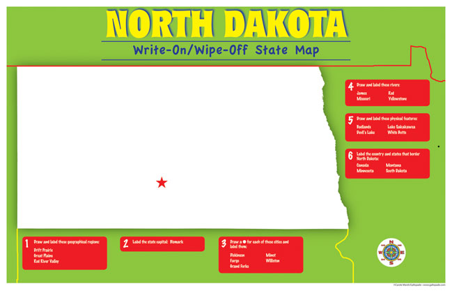 The North Dakota Write-on/Write-off State Desk Mat - State Map is a powerful educational resource that allows teachers and students to use over and over. The North Dakota Write-on/Write-off State Desk Mat - State Map is 11 inches x 17 inches. One side is in color and has several locate and label activities. The other side is black and white that shows major cities, industries, regions and more. The North Dakota state map is on a grid (letter and number) where students can plot coordinates of various locations. The map also helps students to understand relative location, state regions, borders, physical features and more! In addition, there are several activities including fill-in-the-blanks, city grid locations, map scales, map key and compass rose. Use a dry-erase pen to wipe clean to use again and again.