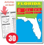 The Class Set of 30 includes 30 Write-on/Wipe-Off maps. Bring classroom lessons up close with the Florida Write-on/Write-off State Desk Mat – State Map. One side features a black and white map with axis and various activities and the other side has a colored blank map with locate and label activities. The Florida Write-on/Write-off State Desk Mat – State Map encourages class participation by letting students engage at their desks. Easily wipes clean after each use.