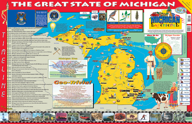 This 22" x 34" poster map features a map of the state with neighbors, cities, counties, and landmarks plus state symbols, a state timeline, geography and history information, and lots more.