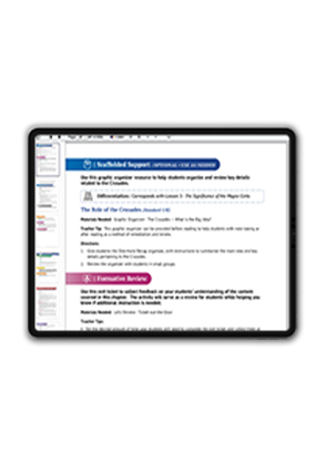 Assignable tools and activities that add rigor to instruction with a focus on inquiry, critical thinking, writing, literacy, and processing skills. Organized to match Student eBook units and chapters, hundreds of skill-building activities enhance content and instruction, making it easy to access, choose and print the resources you want. Plan and document your instructional calendar, assignments, due dates, and test dates in your Chapter Planner. Maximize student comprehension with study guides, writing prompts, vocabulary builders, and even scavenger hunts! Add rigor to your instruction focusing on critical thinking, writing, literacy, and analyzing primary sources - all aligned to state standards. Teaching Tools enhance education while easing the constraints of your time.